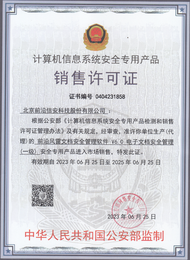 計算機信息系統安全專用產品銷售許可證--前沿風雷V6.0